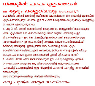 ഇവിടെ മനോരമ, വാര്ത്തകള്ക്ക് ഒരു തുടര്ച്ച കൊടുക്കാന് ഒന്നുമില്ലാത്തതുകൊണ്ട് കച്ചിത്തുരുമ്പായി ഷാള് ഒരു മഹാസംഭവം ആയി ആഘോഷിക്കാനൊരുങ്ങിയതാണോ? അതോ, വീട്ടുകാര് ഷാള് ഒരു ദുരൂഹത എന്ന് കൂടെക്കൂടെ ആവര്ത്തിക്കുന്നതാണോ? ഷാള് ഒരു ദുരൂഹത എന്നമട്ടില് വീട്ടുകാര് കൂടെക്കൂടെ ആവര്ത്തിക്കുന്നതാണെങ്കില് അതുതന്നെ പുതിയൊരു ദുരൂഹതയായി കരുതരുതോ? "ആരെയും നമുക്ക് കണ്ണടച്ച് വിശ്വസിക്കാന് പറ്റില്ലല്ലോ?"